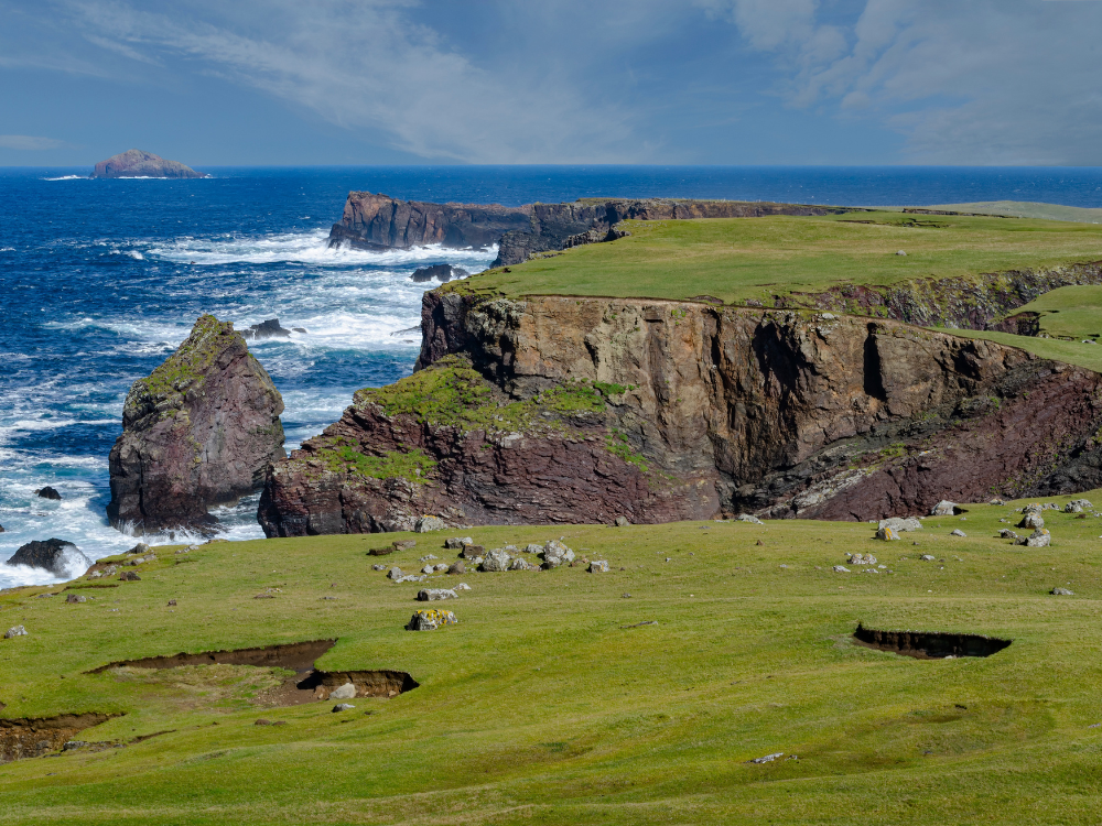 Po śniadaniu przejazd na północno-zachodni kraniec Mainland w rejon Eshaness, słynący z surowych, wulkanicznych krajobrazów. Rozpoczynamy dzień trekkingiem wzdłuż klifów Eshaness (ok. 3 godziny), prowadzącym przez spektakularne formacje skalne i punkty widokowe nad Atlantykiem. W tej części wyspy często można spotkać kuce szetlandzkie, pasące się na nadmorskich wrzosowiskach.