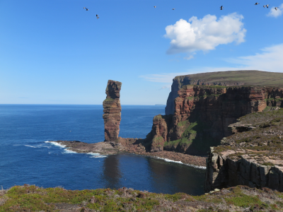 Po śniadaniu przeprawa promowa na wyspę Hoy, jedną z najbardziej dzikich i górzystych wysp archipelagu. Głównym punktem dnia jest trekking do Old Man of Hoy – spektakularnej, ponad 130-metrowej skalnej iglicy wyrastającej bezpośrednio z oceanu. Trasa prowadzi przez wrzosowiska i klifowe wybrzeże, oferując rozległe widoki na Atlantyk oraz północne wyspy Orkadów.
