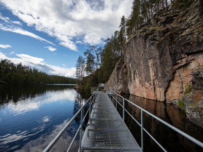 Następnie dalszy przejazd na północ i trekking nad jeziorem Julma-Ölkky, które położone jest w kanionie – jednym z ciekawszych formacji skalnych w Finlandii. Trasa prowadzi wzdłuż stromych ścian skalnych i krystalicznie czystej wody, oferując spektakularne widoki.