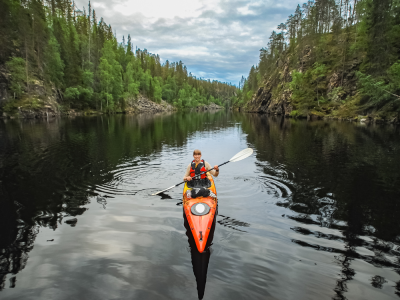 Po południu trasa kajakowa prowadząca przez system 12 połączonych jezior. Spokojny nurt, liczne przesmyki i wyspy pozwalają w pełni doświadczyć bezkresu fińskiej przyrody. W trakcie wyprawy przerwa na posiłek w plenerze. Wieczorne światło oferuje wyjątkowe widoki na taflę wody i otaczające lasy (razem z posiłkiem ok. 6 godz.).