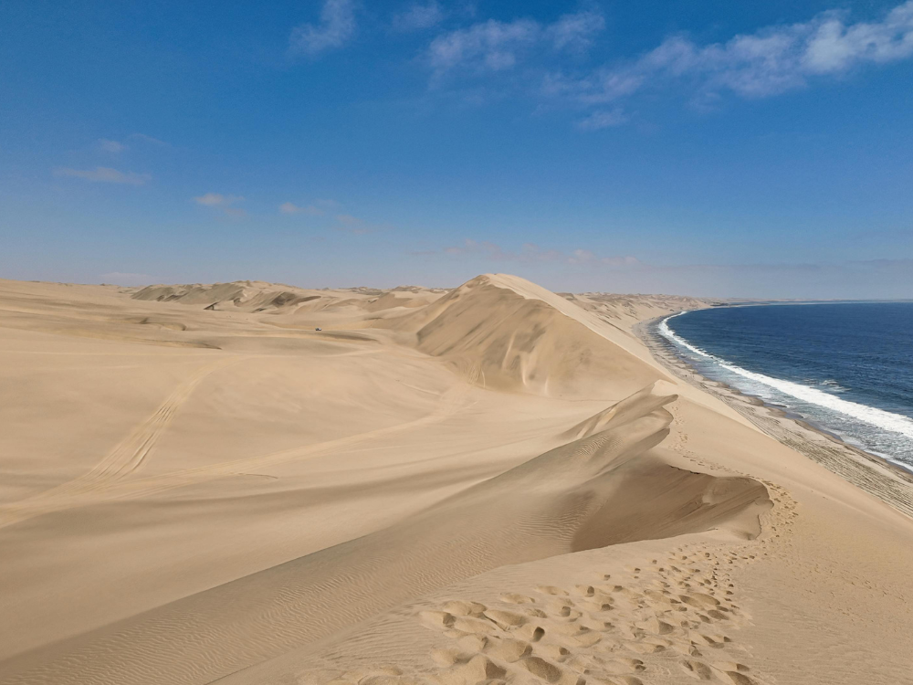 01.05 Rano wypływamy w komfortowy rejs morski, podczas którego obserwujemy foki, delfiny i ptaki morskie. Następnie, w pojazdach 4x4, wyruszamy w stronę Sandwich Harbour – miejsca, gdzie monumentalne wydmy Namib bezpośrednio stykają się z Oceanem Atlantyckim. Lunch serwowany jest w trakcie wycieczki. To dzień pełen kontrastów, przestrzeni i wyjątkowych widoków. Popołudnie i wieczór spędzamy według własnych preferencji w Swakopmund.